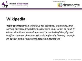 Our flow cytometry expertise. Flow cytometry - Wikipediapdf from AA 1Flow cytometry From Wikipedia the free encyclopedia In biotechnology flow cytometry is a laser- or impedance-based biophysical. Cell sorting is the process through which a particular cell type is separated from others contained in a sample on.